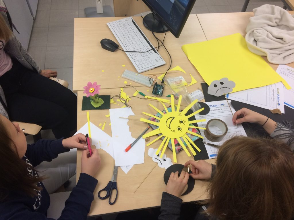 During the pilots, students got familiar with electronic components and circuits (Arduinos, Raspberry Pis), computer programming (Snap4Arduino), 3D modelling (Tinkercad) and 3D printing (Ultimaker) by ideating, planning, creating, programming and sharing (eCraft2Learn craft- and project-based pedagogical model). The process immersed students in hands-on activities, problem solving and collaboration as they worked in teams of two to six members. Teachers facilitated the learning process and supported the students to work through the five stages of the eCraft2Learn pedagogical model.